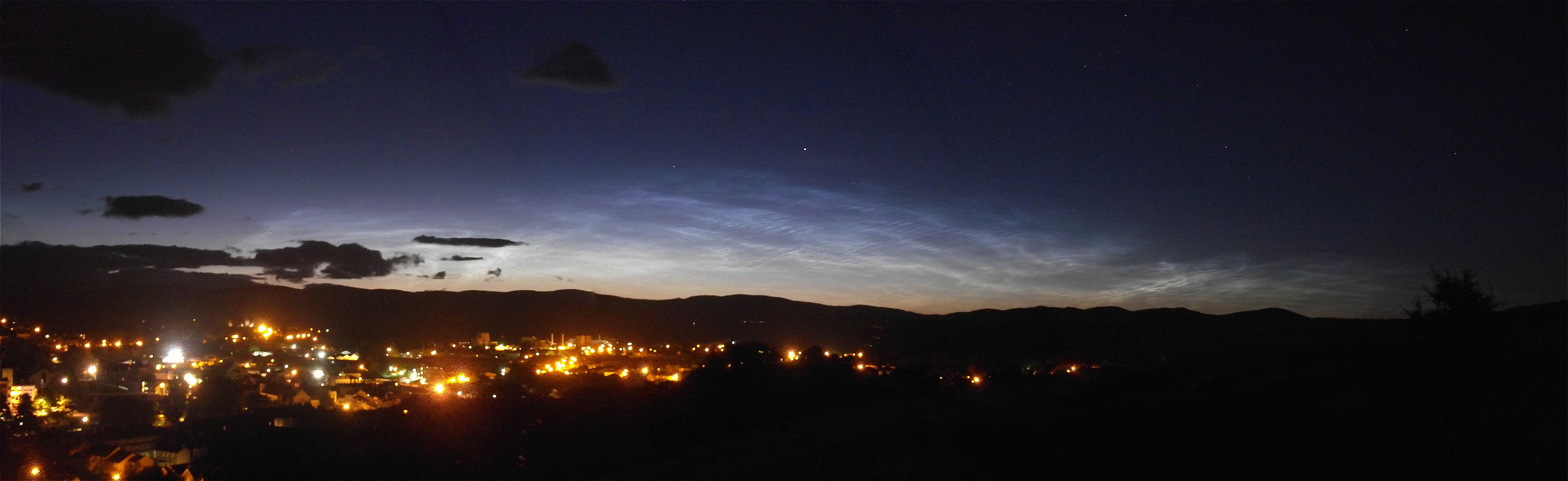 took this stunning panoramic view from Kendal Castle. (Click image for access to a larger version). NLCs are usually seen during the summertime, appearing at sunset. They are thin, wavy ice clouds that form at very high altitudes and reflect sunlight long after the Sun has dropped below the horizon. Scientists don't know exactly why they form, and they seem to be appearing more and more in recent times.