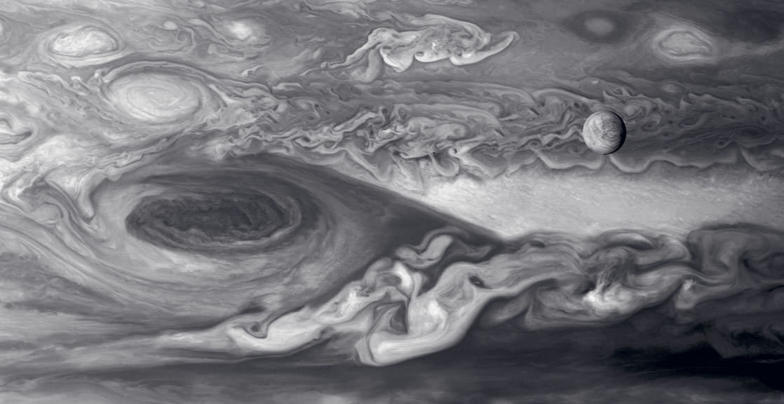 Above is an example of Benson's work, a Voyager image of Europa hovering in front of a tempestuous Jupiter.