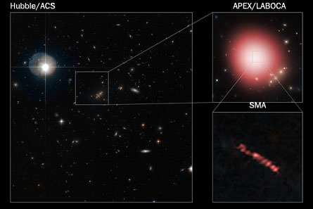 dubbed "the Cosmic Eyelash"; formally it's called SMMJ2135-0102). "This galaxy lies at [a redshift of] 2.32 and its brightness of 106 mJy at 870 μm is due to the gravitational magnification caused by a massive intervening galaxy cluster," and "high resolution follow-up with the sub-mm array resolves the star-forming regions on scales of just 100 parsecs. These results allow study of galaxy formation and evolution at a level of detail never before possible and provide a glimpse of the exciting possibilities for future studies of galaxies at these early times, particularly with ALMA." Nature's telescope giving astronomers