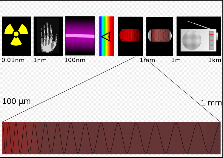 The submillimter wavelength is also called Terahertz Radiation, and is between Infrared and Microwave Radiation on the spectrum. Image: By Tatoute, CC BY-SA 3.0, https://commons.wikimedia.org/w/index.php?curid=6884073[/caption]