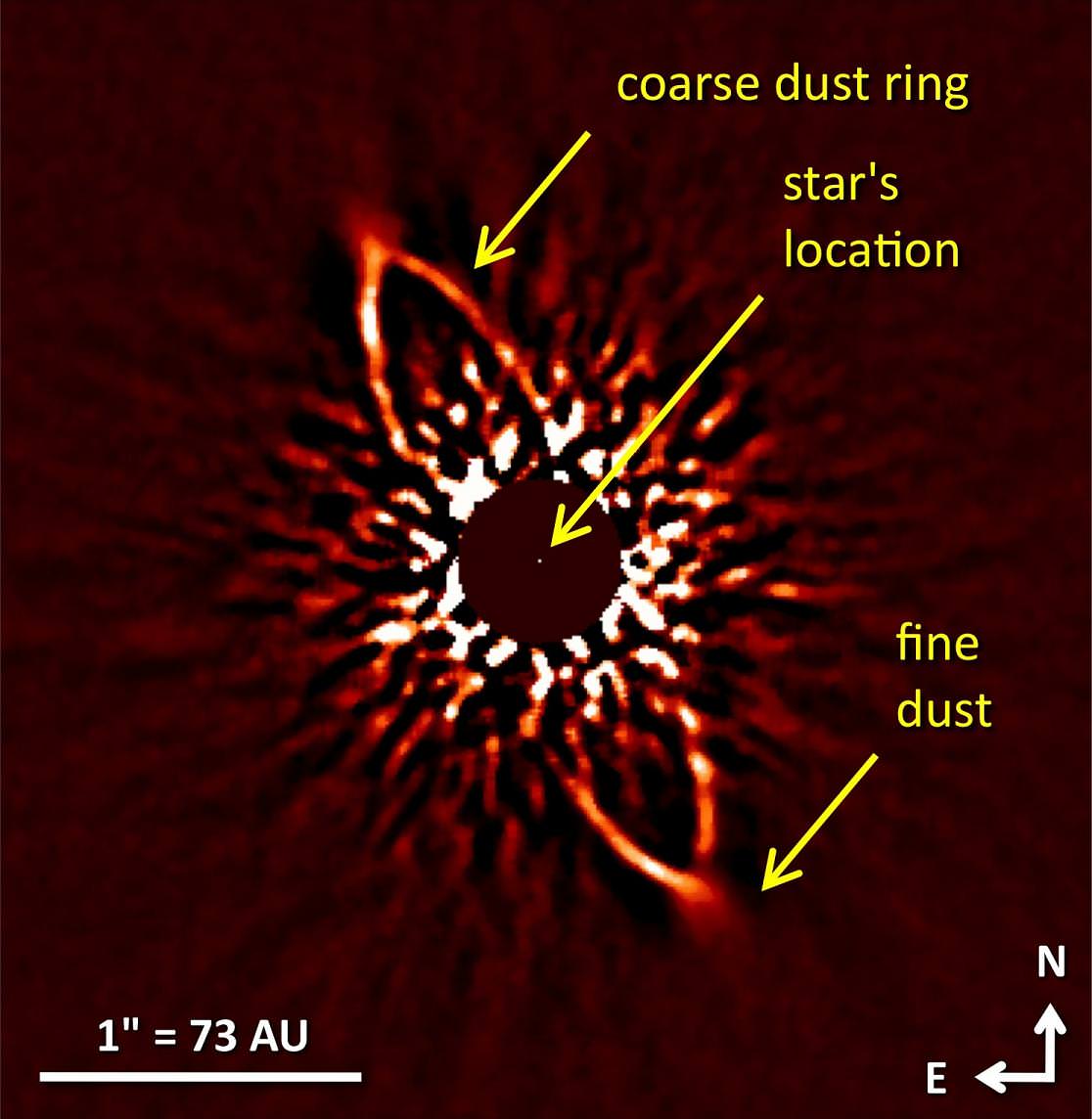 With image accuracy as pinpoint as the Hubble Space Telescope, the Suburu near-infrared depiction allows for extremely accurate measurements by employing its adaptive optics system. This type of advanced astrophotography also allows for angular differential imaging - by-passing the glare of the central star and enhancing the faint signature of the dust ring. Such techniques are able to establish heightened information about the relationship of the circumstellar disk and gelling planets... a process which may begin from the "left-overs" of initial star formation. As surmised, this material could either be picked up by newly formed planets or be pushed out the system via stellar winds. Either way, it is a process which eliminates the majority of the dust within a few tens of millions of years. However, there are a few stars which continue to hold on to a "secondary disk" - a collection of dust which could be attributed to the collision of planetesimals. In the case of HR 4796, this is a likely scenario and studying it may provide a better understanding of how planets could form in this alternate debris disk.