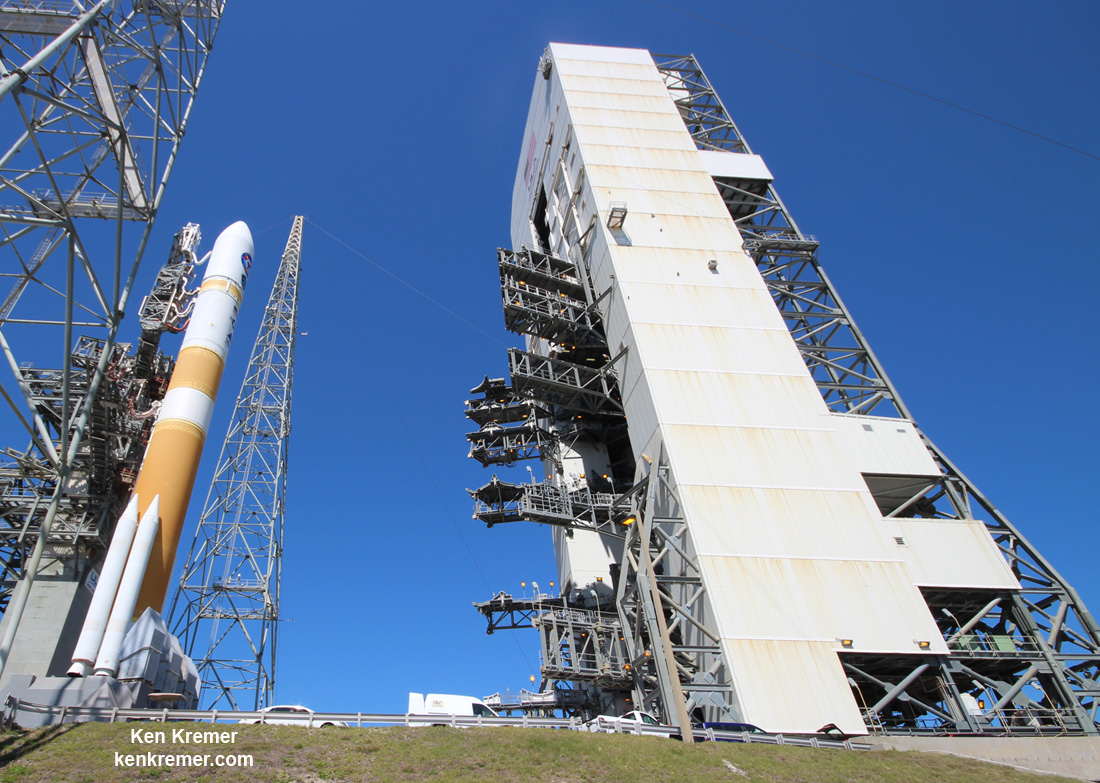 And the launch site is drenched with brilliant blue skies this afternoon as I watched the Delta rocket exposed to the heavens as the mobile service tower rolled away from on site at pad 37.