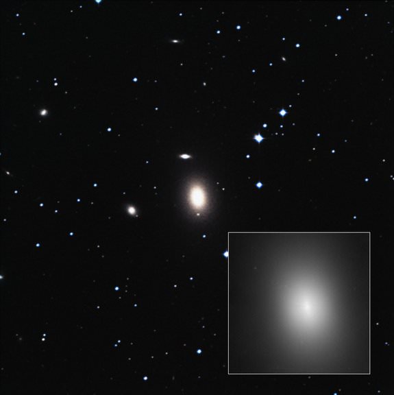 A supermassive black hole of 17 billion solar masses has been found in the elliptical galaxy NGC 1600, a rather isolated galaxy with only dim companions. To date, supermassive black holes have only been found in huge galaxies at the centre of large clusters of galaxies. This image is a composite image from the Hubble and from ground observatories. Image Credit: NASA/ESA/Digital Sky Survey 2.[/caption]