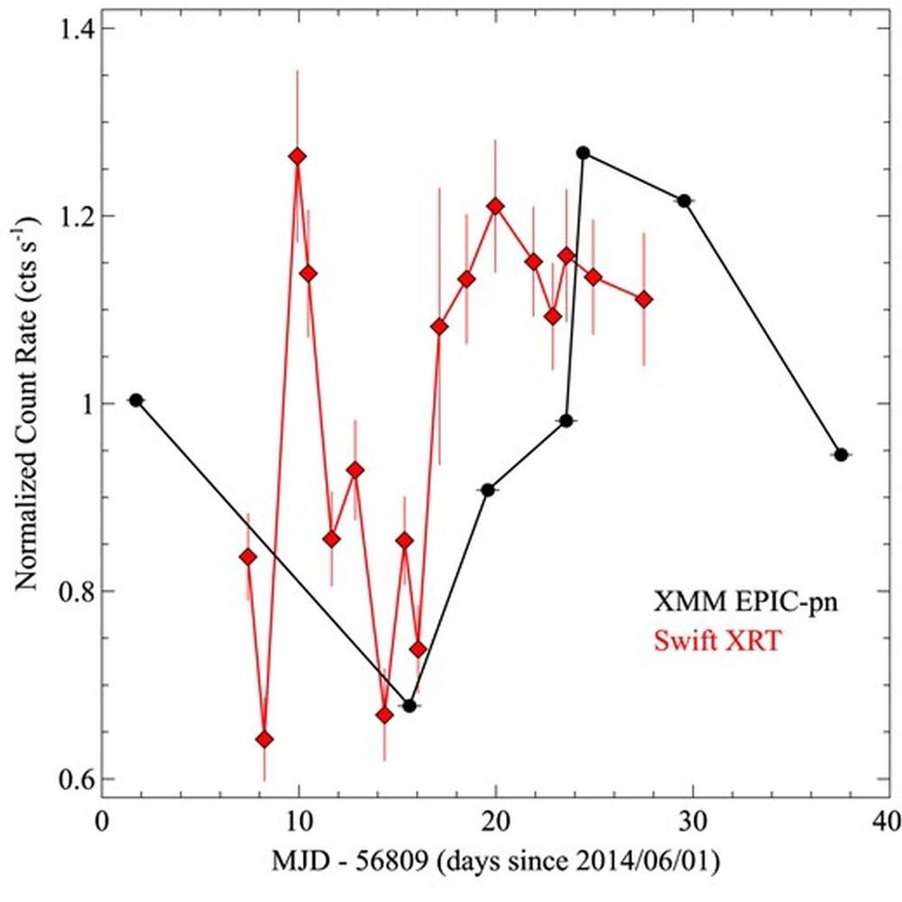 *This figure shows XMM Newton data in black and Swift data in red. The second black data point is from spacecraft orbit 2659 and shows the transient infalling gas at 0.3 the speed of light. "Both data sets show a deep minimum flux near orbit 2659 (day 16), followed by an increase to a peak near orbit 2664 (day 24)," the authors write. Image Credit: Pounds and Page 2025. MNRAS*