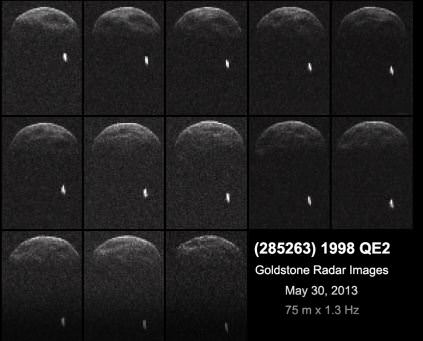Late yesterday, NASA turned the 230-foot (70-meter) Deep Space Network antenna at Goldstone, California towards Asteroid 1998 QE2 as it was heading towards its closest approach to Earth, and they got a big surprise: the asteroid is a binary system. 1998 QE2 itself is 1.7 miles (2.7 kilometers) in diameter, and the newly found orbiting moon is about 600 meters in diameter.