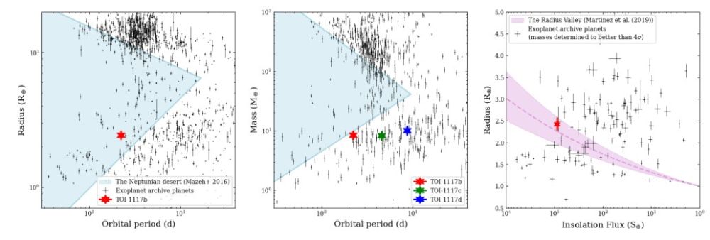 These plots show all NASA Exoplanet Archive planets by mass in radius-period space. Left shows TOI-1117 b (red star) falling within the Neptunian Desert (pale blue region). Middle is a Mass-period plot showing TOI-1117 b (red), c (green), and d (blue) and the Neptunian Desert. Right plots radius against insolation flux and shows TOI-1117 b to be within the Radius Valley (pale pink region). Image Credit: Lockley et al. 2025. MNRAS.