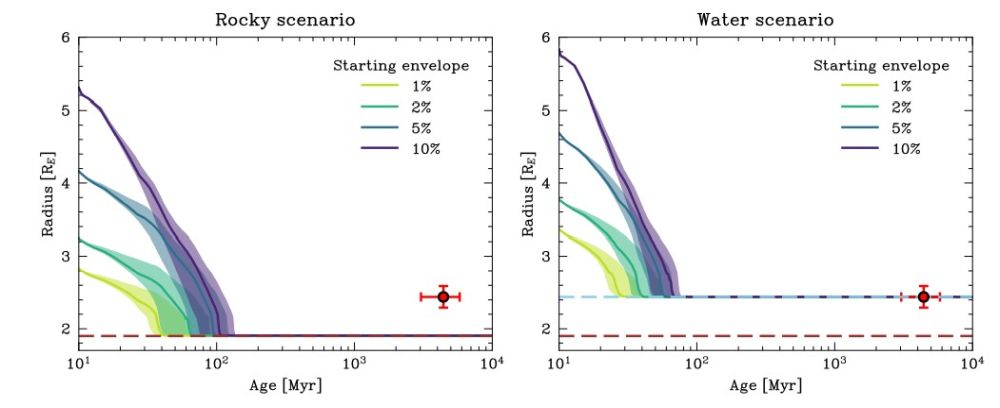 This figure from the research shows the evolution of TOI-1117 b's radius with a range of starting envelope mass fractions, assuming rocky-H/He internal structure with no water (left panel), and a rock-water composition with no gaseous envelope (right panel). The red circle shows the planet's current radius. Each coloured line represents different starting H/He fractions, and the coloured areas around each line represent different X-ray irradiation histories from a solar-mass star. Image Credit: Lockley et al. 2025. MNRAS.