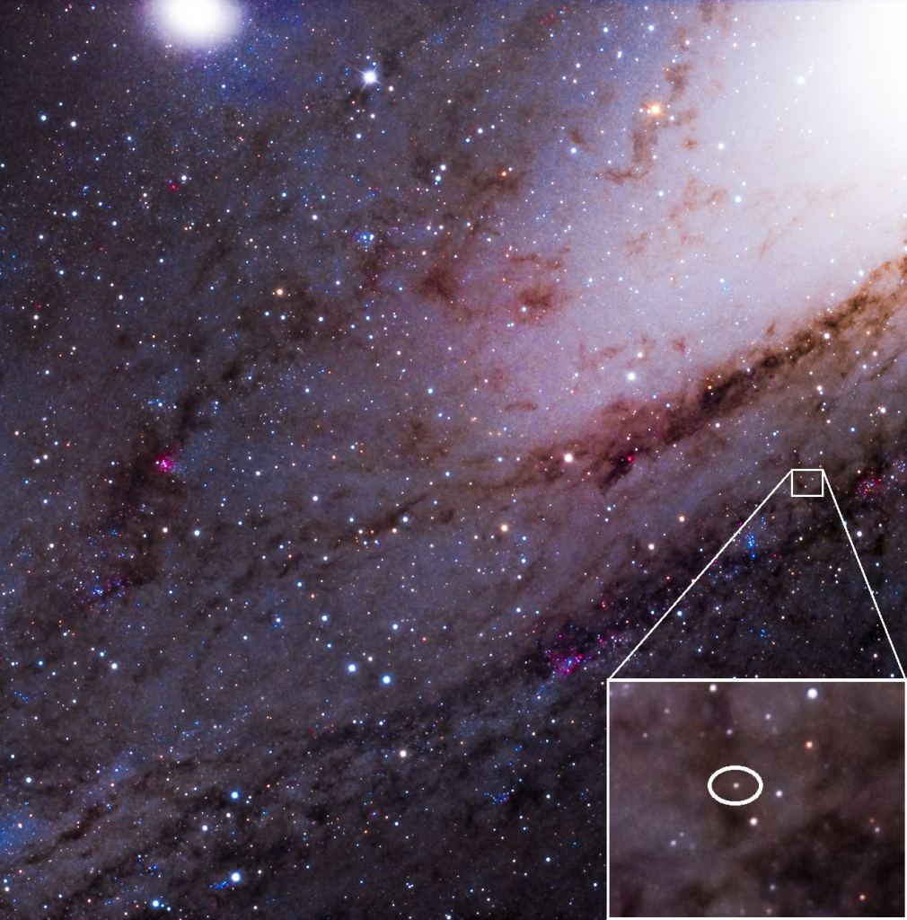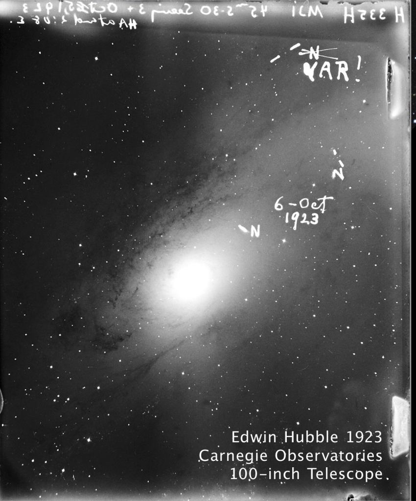 That star highlighted in the photo is called M31_V1 and resides in the Andromeda Galaxy. The Andromeda – AKA M31- is the closest galaxy to our own Milky Way. But before it was known as a galaxy, it was called the Andromeda Nebula. Before this particular star in Andromeda was studied by Edwin Hubble, namesake of the Hubble Space Telescope, we didn't actually know if other galaxies even existed. Think about that! As recently as a hundred years ago, we thought the Milky Way might be the ENTIRE Universe. Even then…that's pretty big. The Milky Way is on the order of 150,000 light years across. A light year is about 10 TRILLION kilometers so even at the speed of light it would take nearly the same length of time to cross the Milky Way as humans have existed on planet Earth. M31_V1 changed all that.