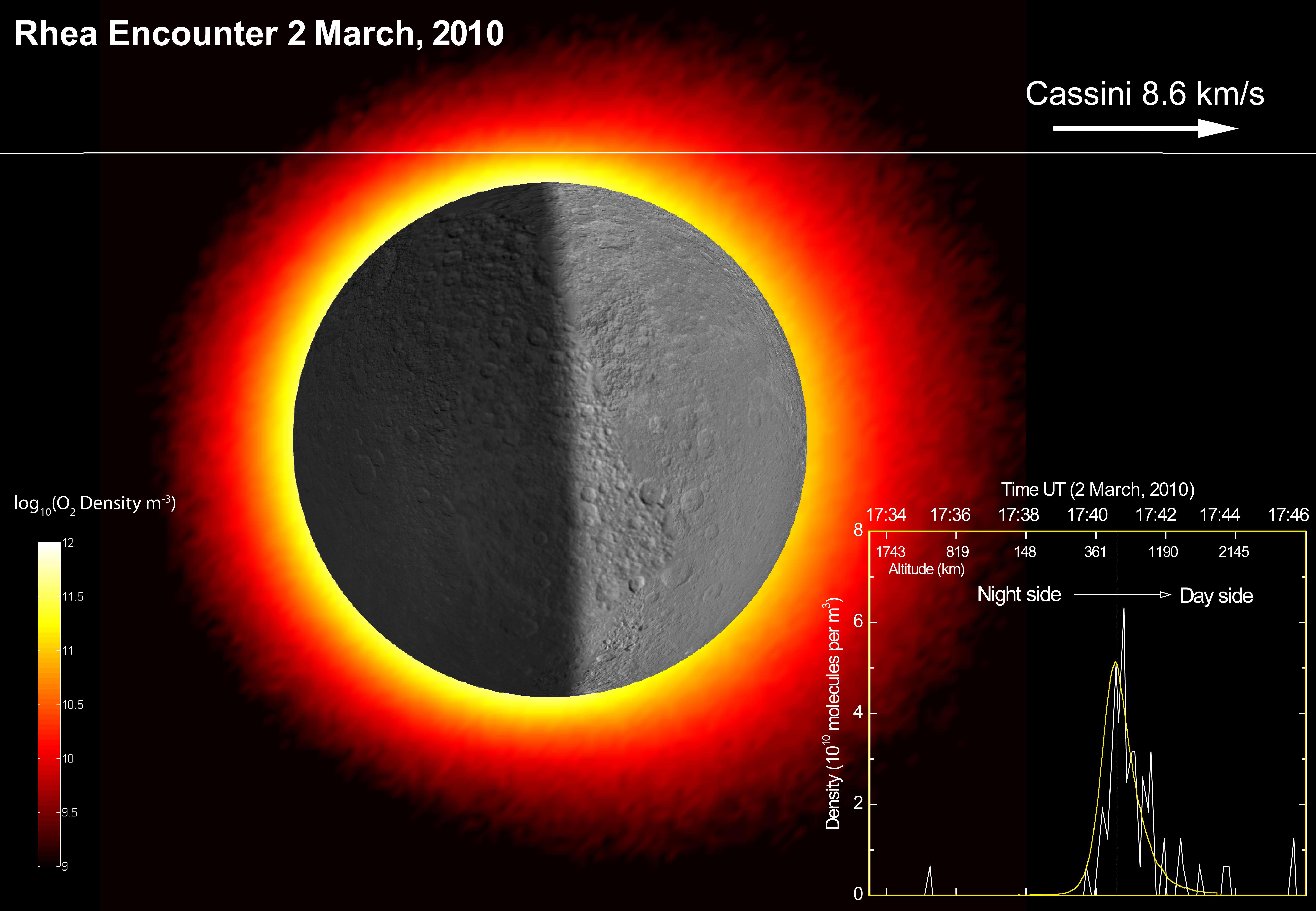 A few years ago, astronomers thought they found wispy rings around Saturn's moon Rhea. Although the possibility of rings around this icy moon was later nixed, astronomers knew there was still something around Rhea that was causing a strange, symmetrical structure in the charged-particle environment around Saturn's second-largest moon. Now, new observations have shown something else around Rhea that was completely unexpected: an oxygen atmosphere. In March of this year, the Cassini spacecraft made a close flyby of Rhea and recorded data showing a thin atmosphere made up of oxygen and carbon dioxide.