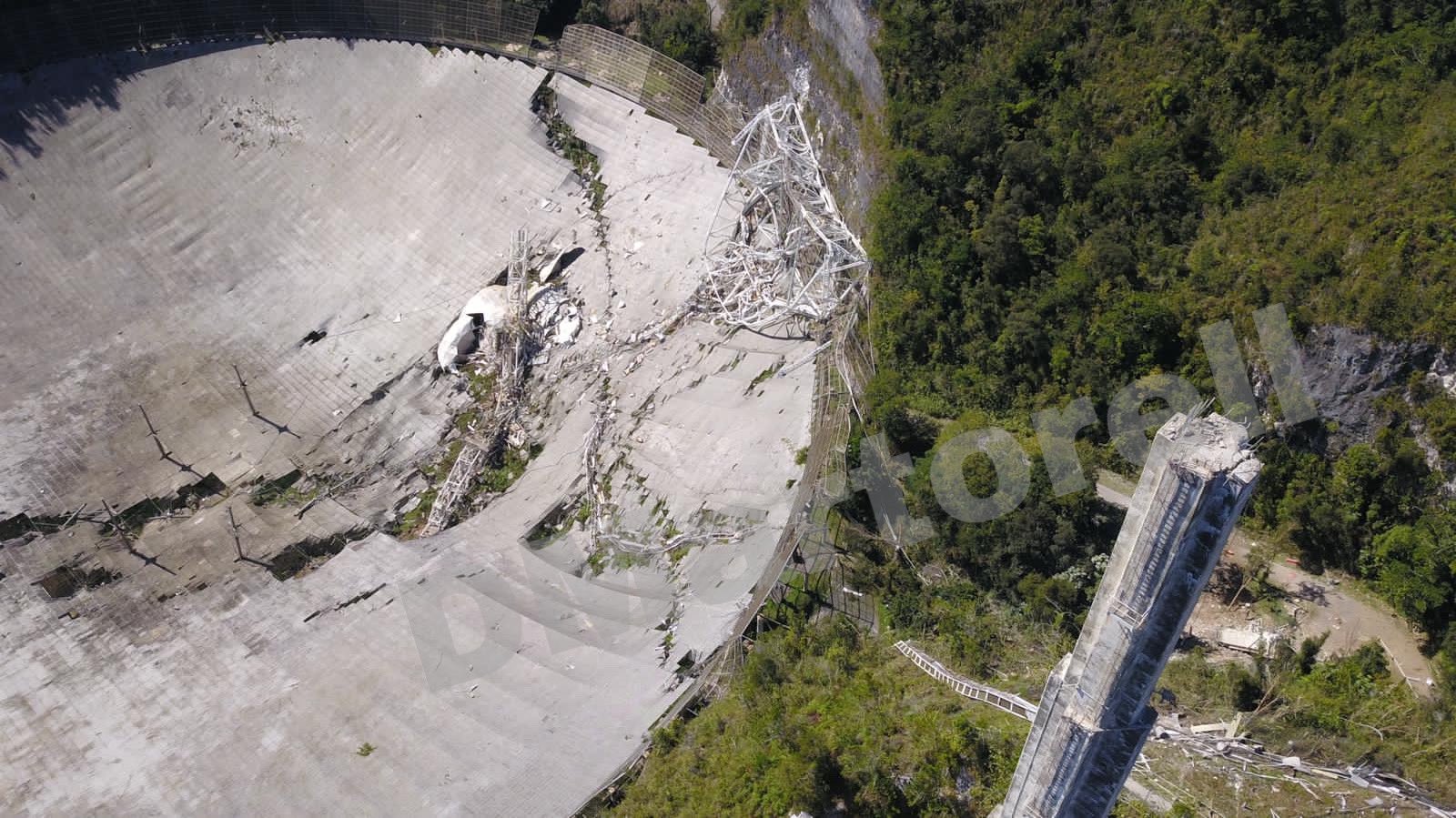 Lead image: Aerial view of the devastating damage to the Arecibo Observatory following the collapse of the telescope platform on December 1, 2020. Photo copyright and courtesy of Deborah Martorell.