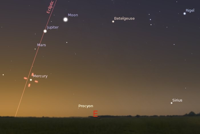 Note that we have a nice line-up of planets in the dawn sky (see intro chart), which are joined by a waning crescent Moon this weekend. Jupiter and Mars ride high about an hour before sunrise, and if you can pick out Mercury at magnitude -0.5 directly below them, you should have a shot at spotting Sirius far to the south.