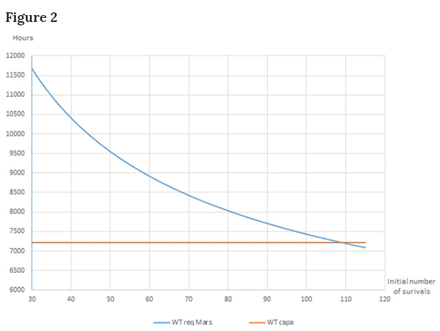 Basically, Salotti's equation comes down to time. How much time is required for survival vs. how much time is available. For Salotti, the effective number of people required to balance the time equation is 110 on Mars. "It is based on the comparison between the required working time to fulfil all the needs for survival and the working time capacity of the individuals," he writes in the conclusion.