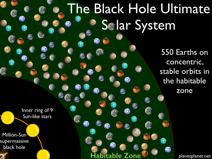 - an American physicist currently at the University of Bourdeaux - created a hypothetical planetary system where a black hole lies at the center. Based on a series of gravitational calculations, he determined that a black hole would be capable of keeping nine individual Suns in a stable orbit around it, which would be able to support 550 planets within a habitable zone.
