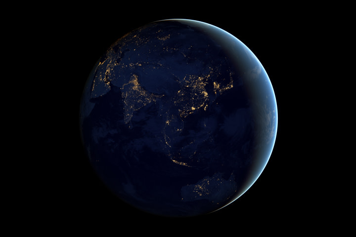 This image of Asia and Australia at night is a composite assembled from data acquired by the Suomi NPP satellite in April and October 2012. Credit: NASA, NOAA, and the Department of Defense.