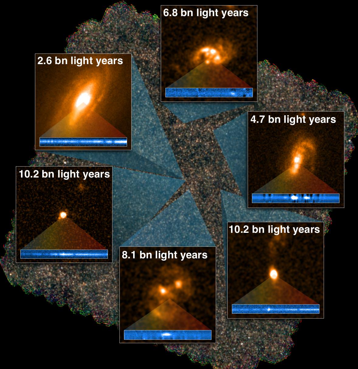 By gathering literally hundreds of hours of spectral data on the galaxies with the Keck telescopes, estimates of their distances could be determined as well as their temperatures and how often new stars are born within them.