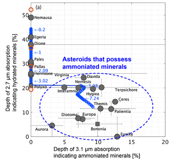 These asteroids were large enough to be differentiated, meaning they had cores and mantles with different compositions. The mantles were rich in water, and the cores were denser. "Ammoniated phyllosilicates form within the water-rich mantles of the differentiated bodies containing NH3and CO2under high water-rock ratios (>4) and low temperatures (<70°C)," the study explains.