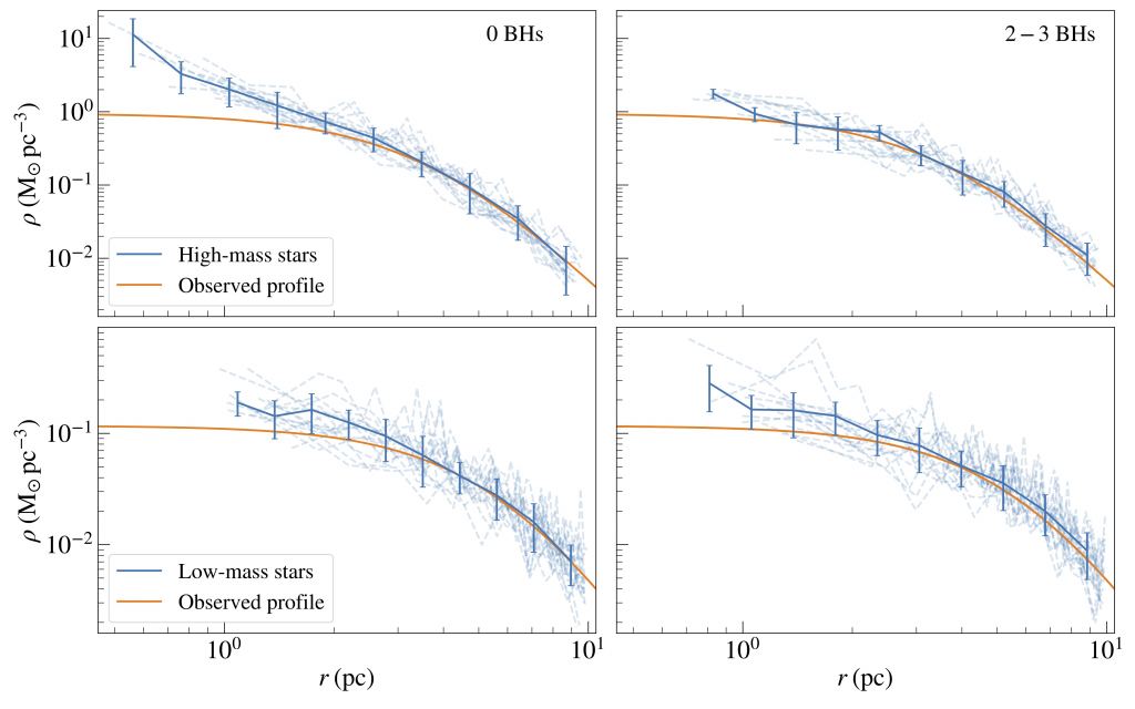 One of the things the team compared is what is known as a half-mass radius. That is the radius within which half the cluster's mass is contained. With the presence of some black holes, the cluster should be slightly more dense, and thus the half-mass radius should be smaller. Another aspect is the central density, which should spike a bit if black holes are present. Given all this, a comparison between N-body simulations and Gaia data finds that the best model predicts the presence of 2 or 3 stellar-mass black holes.