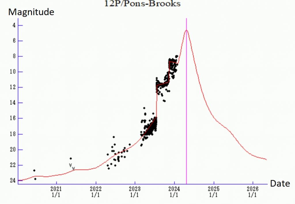 Keep in mind, an outburst near perihelion could vault Comet 12P up into naked eye brightness. Clearly, 12P Pons-Brooks has an active nucleus, estimated to be about 30 kilometers across. For context, Hale-Bopp had a nucleus estimated at 40-80 kilometers across. Comet 12P reached magnitude +4.5 during the last pass in 1954.