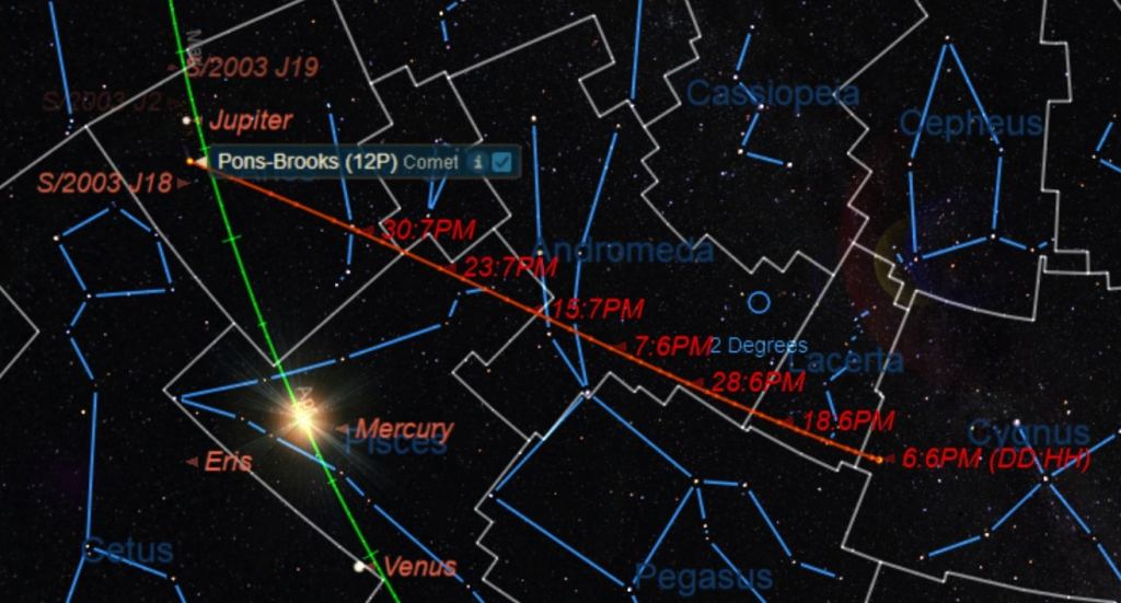 On a 71 year orbit (just a tad shorter than Halley's Comet) Comet 12P can reach +5th magnitude on a favorable apparition. The name for the comet comes from the original discoverer astronomer Jean-Louis Pons, who first spotted the comet from the Marseilles Observatory in July 1812, and William Robert Brooks, who recovered the comet on the next apparition and cliched its periodic nature in 1883.