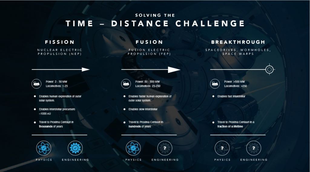 Simply put, there's no way long-distance missions can be done in a reasonable amount of time using chemical propulsion. For that to happen, says Dr. White, we need to think beyond the realm of known physics. To that end, he and his colleagues have adopted a research plan based on three broad categories of theoretical propulsion, each one more advanced than the last. The first (Fission) is dedicated to advancing the technology of Nuclear Electric Propulsion (NEP), which NASA and other space agencies are investigating for their future exploration goals.