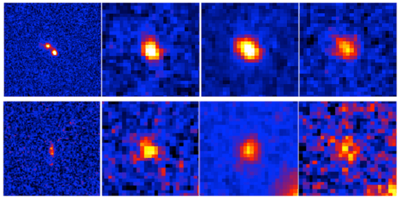 The Subaru Telescope/Suprime-Cam images showing early-Universe galaxies in the (UV) wavelength, some of which have double-component structures. Credit: Ehime University