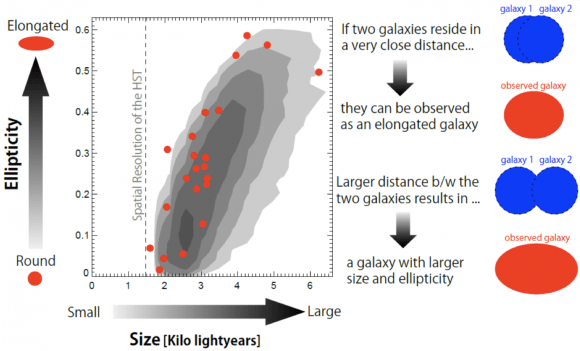 In a paper published by The Astrophysical Journals, the team indicated that out of the 54 galaxies they observed, 8 had double-component structures, which indicated that they were the result of two galaxies merging with each other. In addition, they found that with the remaining 46 galaxies, their elongated shapes - as well as a correlation between their ellipticity and size - might indicate that they too were merging galaxies.