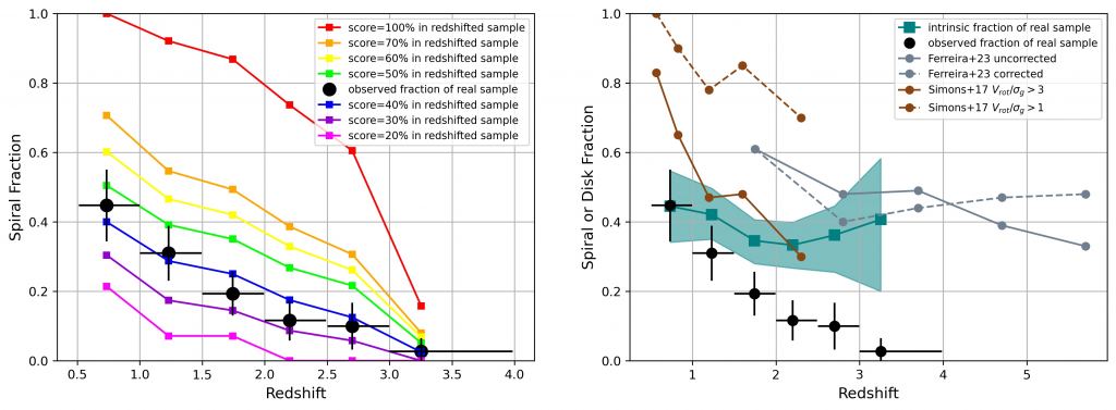 Of these galaxies, 216 were classified as spirals. The authors were careful to note that some may be merging galaxies that were misclassified, but even then 108 of the galaxies were unanimously classified as spirals by evaluators. When the team arranged them by redshift, they found that while the fraction of spirals decreased as you went further into the past, the fraction of spirals at redshifts above z = 3 was much higher than expected. When the team calibrated observations, they found about a fifth of galaxies at z = 3 are spiral galaxies. These very early galaxies would have had to become spirals less than two billion years after the Big Bang, meaning that there would have been little time for mergers and collisions to be the cause.