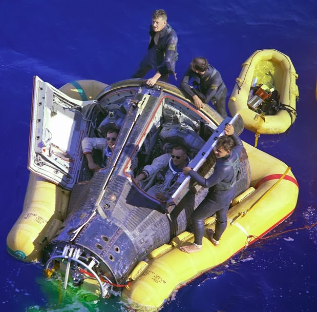 Six and a half orbits and ten hours and 44 minutes after you've thunderously launched into space, you violently re-enter Earth's atmosphere and splash down in a pitching ocean. Obviously, you have to throw up, and so does your crewmate. But there's just one air sickness bag.