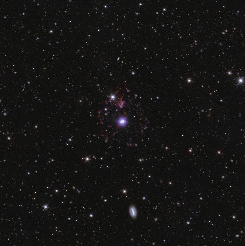 A zoom-in of the Deep Field North shows the Cat's Eye Nebula. The dot in the center is the star, surrounded by loops of gas and dust previously ejected by the star. The background is populated by millions of galaxies. Image Credit: ESA/Euclid/Euclid Consortium/NASA, image processing by J.-C. Cuillandre, E. Bertin, G. Anselmi. Licence:CC BY-SA 3.0 IGO