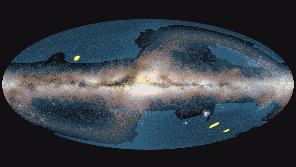 The three yellow regions are Euclid's deep fields, and the large blue region is its wide field. Other regions are avoided because they are dominated by Milky Way stars and interstellar matter or by diffuse dust in the Solar System – the so-called zodiacal light. The Euclid Deep Field North is on the upper left, and the Euclid Deep Field Fornax is on the lower right. The Euclid Deep Field South is between the Large Magellanic Cloud and the Euclid Deep Field Fornax. Image Credit: ESA/Euclid/Euclid Consortium/NASA/Planck Collaboration/A. Mellinger – Acknowledgment: Jean-Charles Cuillandre, João Dinis and Euclid Consortium Survey Group. Licence:CC BY-SA 3.0 IGO