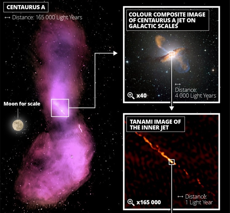 Located over 13 million light-years from the Milky Way, Centaurus A is the closest radio galaxy to our own and (when imaged in radio wavelengths) is one of the largest and brightest objects in the night sky. Using the same interferometry technique that allowed for images of M87 to be taken, the team to observe Centaurus A with incredibly sharp resolution at a wavelength of 1.3 mm.