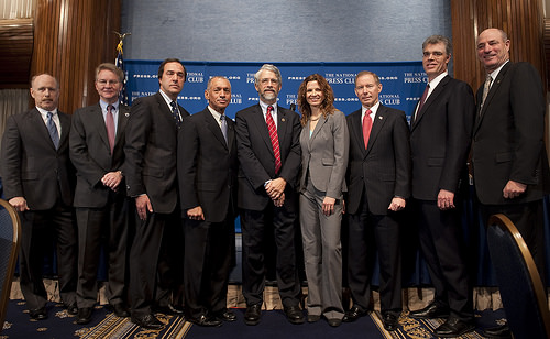 Top photo notation: From left, Ken Bowersox, VP Astronaut Safety, SpaceX, David Thompson, CEO, Orbital Science Corporation, Mark Sirangelo, VP and Chair, SNC Space Systems Board, Sierra Nevada Corp., NASA Administrator Charles Bolden, Assistant to the President for Science and Technology and Director of the White House Office of Science and Technology Policy Dr. John P. Holdren, Jane Poynter, President and Chair, Paragon Space Development Corp., Brewster Shaw, VP and General Manager, NASA Systems, Boeing, Robert Millman of Blue Origin, and, Mike Gass, President and Chief Executive, United Space Alliance.