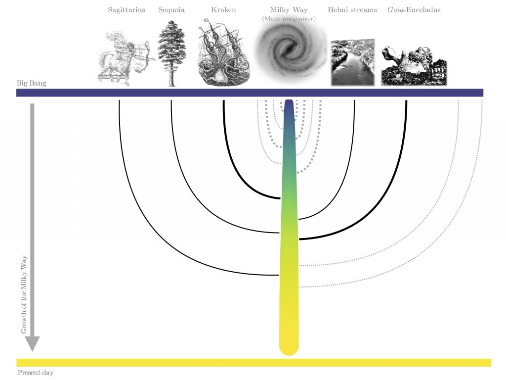 The results show a history of violence. The smaller galaxies, with awesome names like Kraken and Sequoia, merged with our galaxy billions of years ago. Some of those galaxies were large enough to distort the Milky Way for a billion years or more as it recovered from the collision. In total, the Milky Way suffered about 5 mergers with galaxies containing at least 100 million stars, and ten more with galaxies hosting at least 10 million stars.