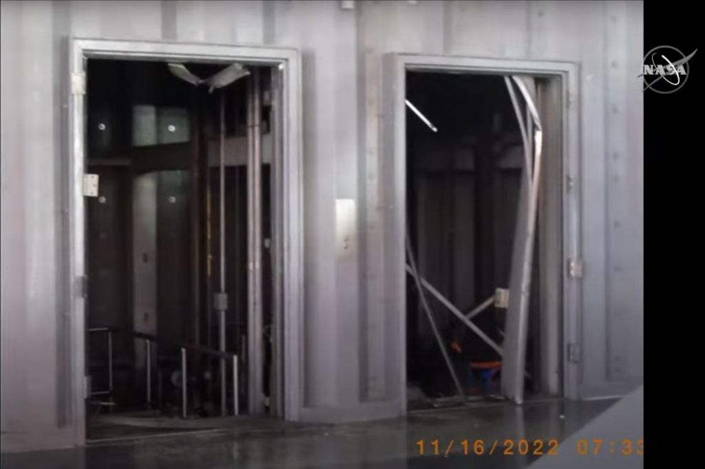 Damage included discoloration and peeling of paint on the pad, two cameras that were rendered inoperable, as well as the destruction of a pair of elevator doors, blown out by the intense pressure at launch. The upper levels of the mobile launcher are currently only accessible by stairs, and the elevators will take several months to repair.