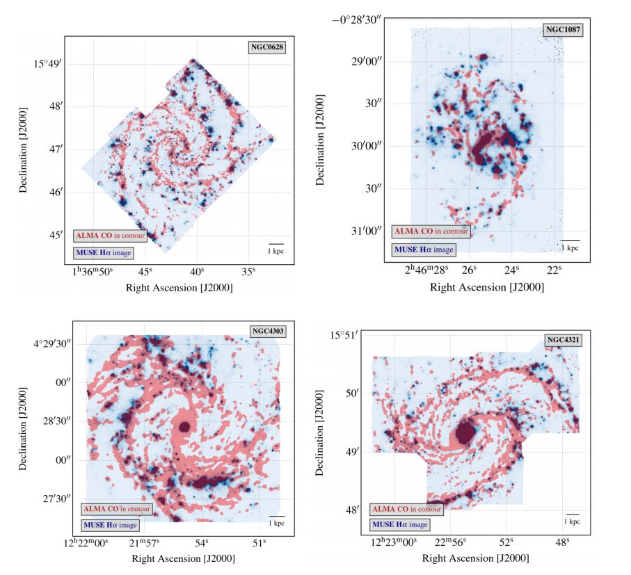 Once hydrogen is excited by the energies of newly forming and young stars, it releases a light known as Hydrogen Alpha. H-alpha is the brightest feature in the spectrum of glowing hydrogen and is how we observe much of the Universe. Combining the hot and cold maps of these GMCs in other galaxies reveals the environment in which stars are forming. An instrument called MUSE on the Very Large Telescope maps the glowing H-Alpha where ALMA detects the cold CO emissions. The finest details resolved by ALMA in the target galaxies are approximately 100 parsecs in diameter (about 326 light years). The researches note this is "cloud-scale" resolution as the target GMCs are also about 100 parsecs in diameter. At this resolution, the clouds can be distinguished as individual structures separate from the structures of the rest of their home galaxies.