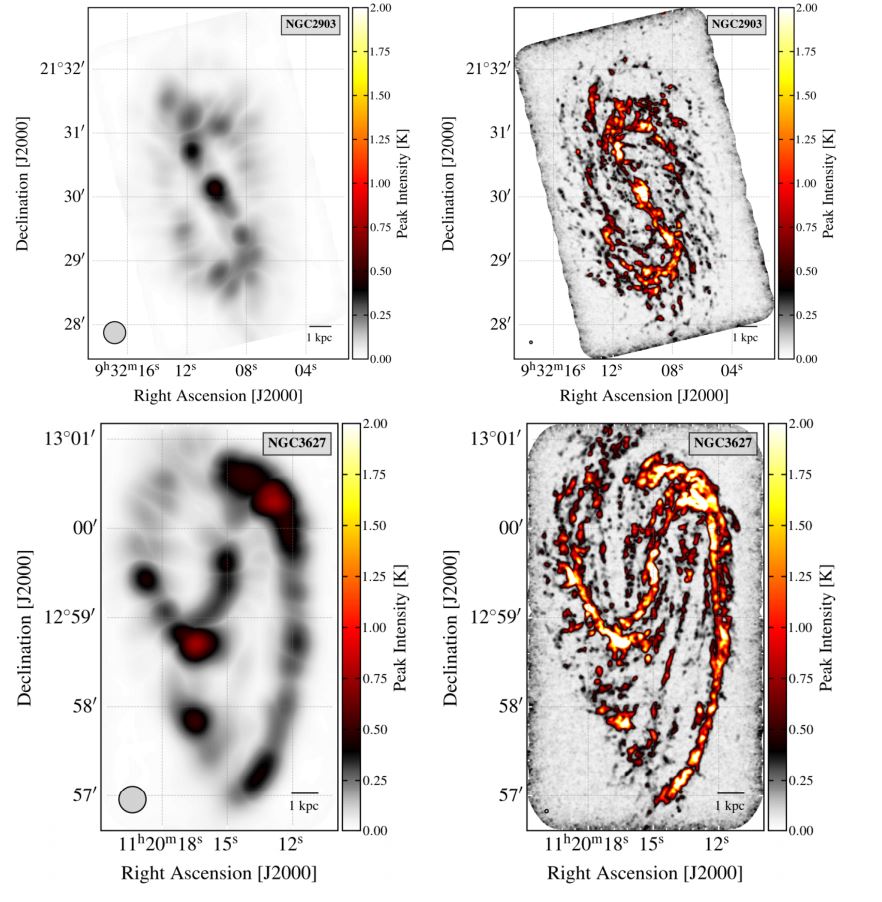 I'd never seen galaxy images like this before. Nobody had! These images highlight star forming regions in nearby(ish) galaxies. There are still a number of unanswered questions surrounding how star formation actually occurs. To answer those questions, we are observing galaxies that are actively forming stars within giant clouds of gas. Until recently, we didn't have the resolution needed to clearly image the individual gas clouds themselves. But images released by a project called PHANGS (Physics at High Angular resolution in Nearby GalaxieS) in a collaboration between the European Southern Observatory Very Large Telescope and the Atacama Large millimeter/submillmeter Array (ALMA) have provided never before seen detail of star forming clouds in other galaxies.
