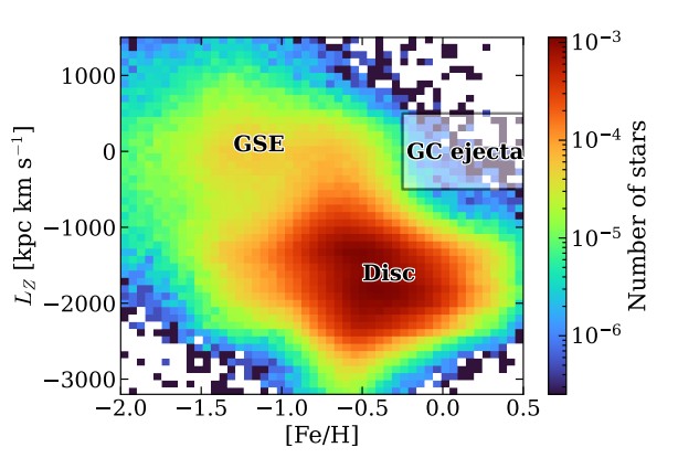 This figure is a histogram of metallicity (Fe/H) and Lz (vertical angular momentum) for stars in the DESI data. Areas occupied by different galactic components and GC ejecta are highlighted. Image Credit: Verberne et al. 2025. Astronomy and Astrophysics.
