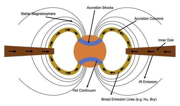 FU Ori stars are T-Tauri stars that represent the most actively accreting young stellar objects (YSOs). The outward magnetic pressure from T-Tauri stars prevents the disk from touching the star. Astronomers think that classical T-Tauri stars accrete material along their magnetic field lines and deposit on the poles in a process called magnetospheric accretion.