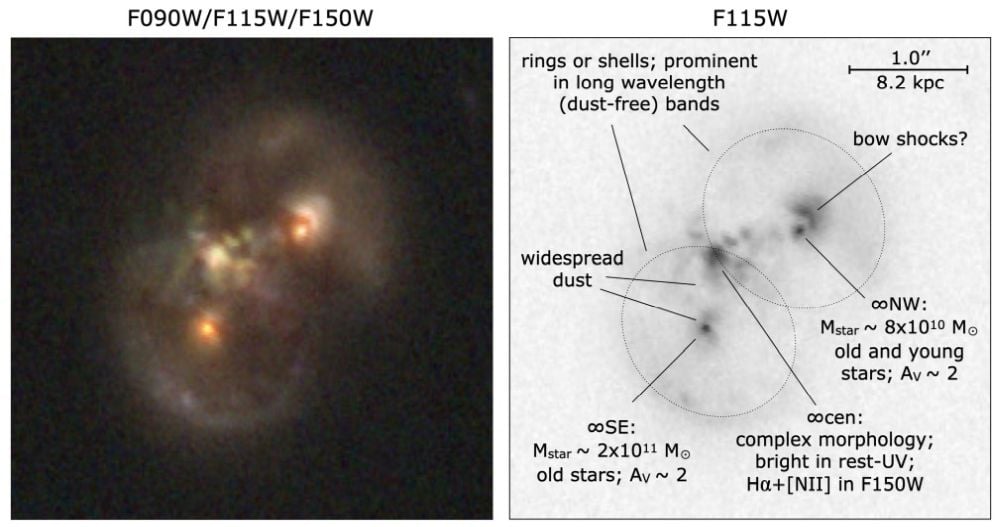 "We report the discovery of an unusual z=1.14 object, dubbed the Infinity galaxy, in JWST imaging of the COSMOS field," the paper states." The authors say it's morphology suggests it was created when two galaxies with parallel disks collided, creating collisional rings around both galaxies. Keck, Chandra, and VLA data all indicate that the Infinity galaxy hosts an actively-accreting SMBH. "Remarkably, the SMBH is not associated with either of the two nuclei, but is in between them in both position and radial velocity," the paper states.