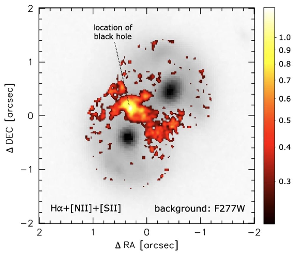 “There is quite a bit of circumstantial evidence for this," van Dokkum explained. "We observe a large swath of ionized gas, specifically hydrogen that has been stripped of its electrons, that’s right in the middle between the two nuclei, surrounding the supermassive black hole. We also know that the black hole is actively growing – we see evidence of that in X-rays from NASA’s Chandra X-ray Observatory and radio from the Very Large Array. Nevertheless, the question is, did it form there?"