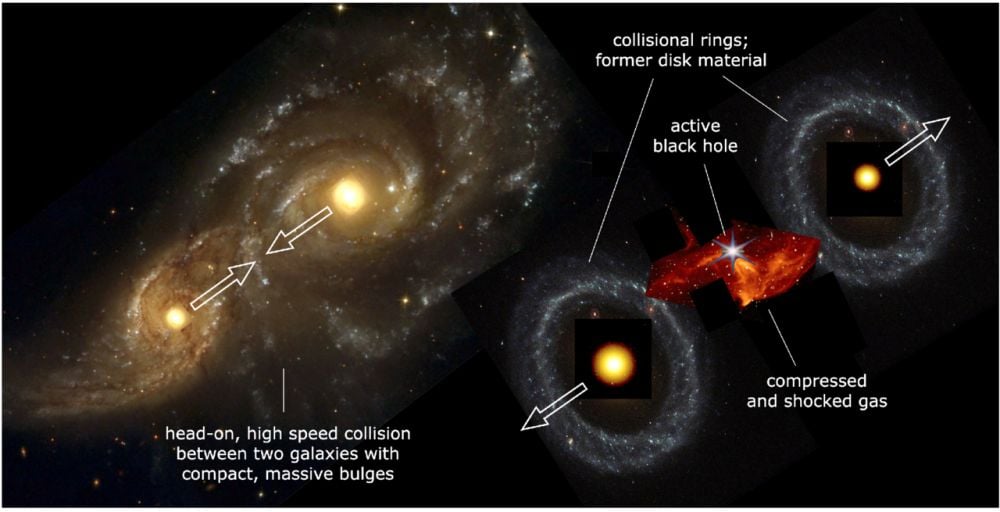 *This schematic explains how a head-on collision between two galaxies with massive, compact bulges could create the Infinity galaxy. "The bulges survived the collision, and the inner disk stars were swept up in outwardly expanding collisional rings around the bulges," the authors explain. "Compression and shocks in the colliding gas likely produced a dense gaseous remnant in between the nuclei, as has been observed in the bullet cluster on much larger scales. It is proposed that the black hole formed within this gas. Image Credit: Pieter van Dokkum et al 2025 ApJL 988 L6*
