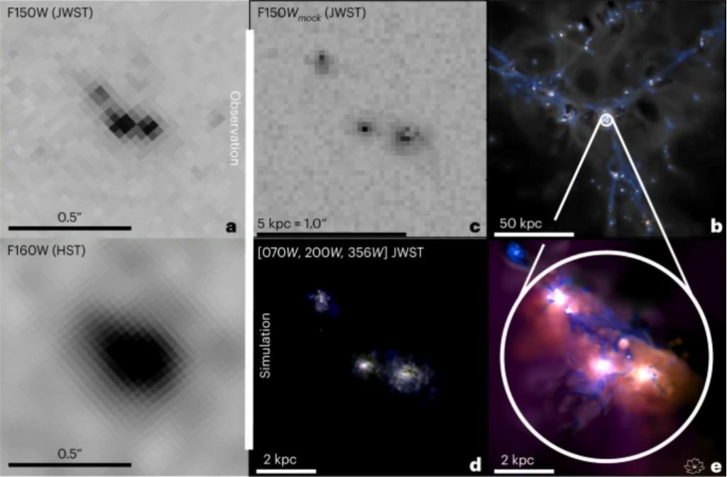 According to the authors, it tells us that galactic mergers and their abundant star formation are behind the Lyman-alpha emissions. A galactic merger simulation produced a mock JWST image that looks remarkably like the actual JWST image of interacting galaxies.