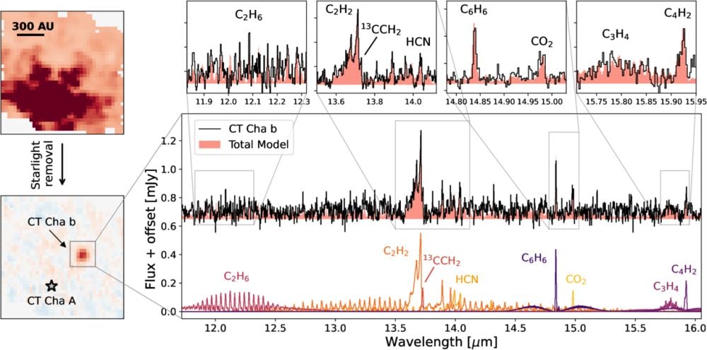 The JWST found multiple carbon-bearing molecules in CT Cha b's circumplanetary disk. This carbon-rich chemistry contrasts with the observed atmospheric chemistry of exo-gas giants. "This carbon-rich chemistry is also in stark contrast to the spectrum of the disk surrounding the host star, CT Cha A, which shows no carbon-bearing molecules," the authors write.