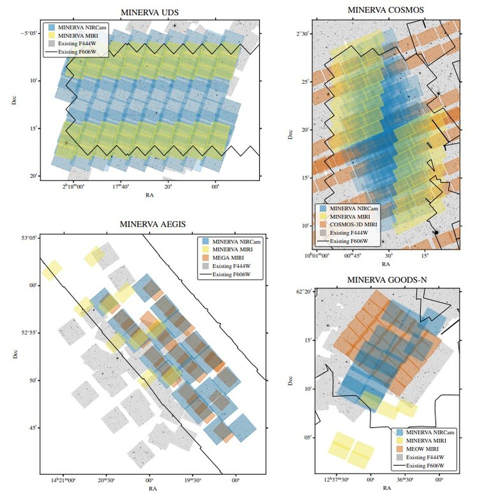 *This image shows the four extragalactic fields covered by MINERVA. They've all been observed before by the JWST, but not with the same depth. Image Credit: Muzzin et al. 2025/MINERVA*