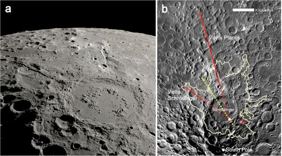 Our Moon continues to surprise us with amazing features. Scientists recently shared new information about two canyons that branch out from a major lunar impact. The site is the Schrödinger basin near the Moon's South Pole. It formed when an asteroid or possibly even a leftover planetesimal slammed into the surface. It took only minutes to dig out that huge crater and split the landscape to make two huge rifts that extend from the site.
