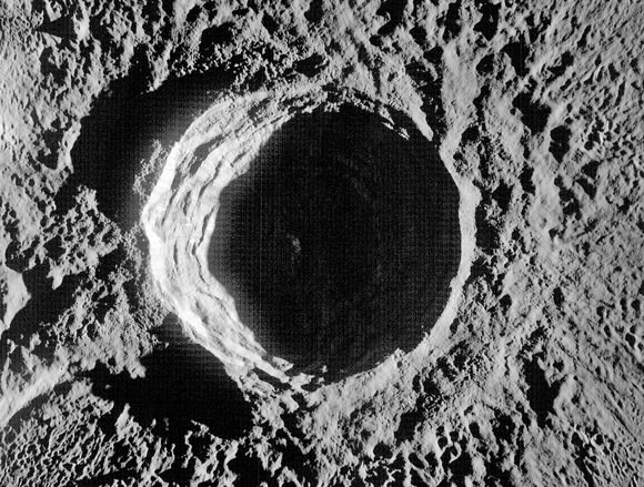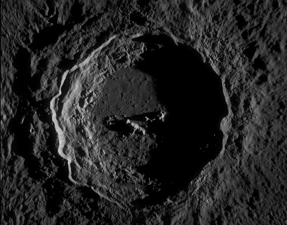 [caption id="attachment_74084" align="aligncenter" width="580" caption="Copernicus Crater on the Moon, captured by LROC's wide angle camera. Image processing by Maurice Collins"]
