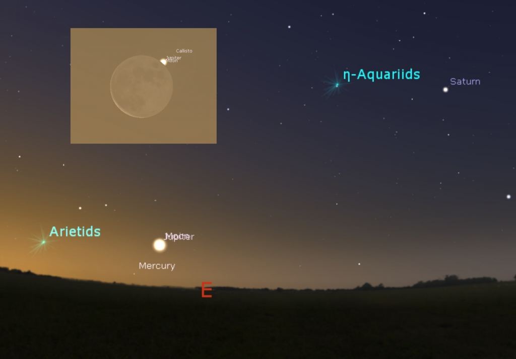 The occultation is the last of four for Jupiter in 2023, and favors western North America at dawn. The Moon is an old waning crescent just 5% illuminated, while -2ndmagnitude Jupiter is 34" across. Both are 26 degrees from the Sun on the morning of May 17th.