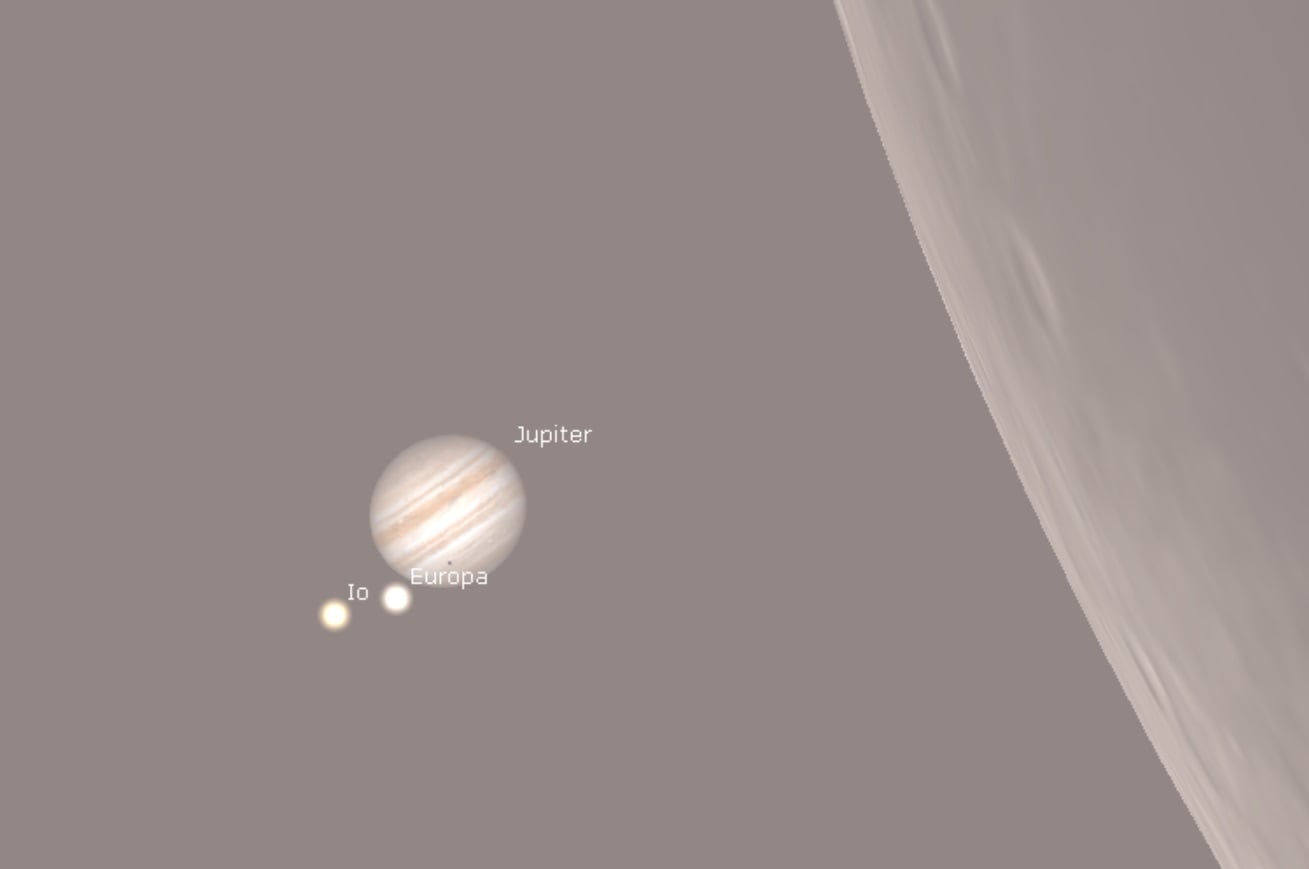 To be sure, the Moon occults several planets worldwide per year. But what makes this one so odd is that two of Jupiter's major moons Io and Europa are casting shadows on the Jovian cloud-tops while the occultation is underway (!) This strange view is revealed during egress, and runs out until 12:56 Universal Time (UT) when Europa's shadow slips past Jupiter.