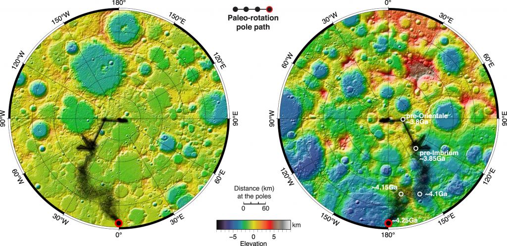 Since a crater shifts the mass distribution slightly, it also shifts the Moon's axis of rotation slightly. The team basically rewound the clock for about 5,200 crater impacts spanning more than 4 billion years of history. They found that the Moon's orbital axis has shifted by about 10 degrees in that time. That might seem like much, but it's pretty impressive to track the Moon's rotation over billions of years. In the future, the team would like to include more data, including effects such as early volcanic eruptions.