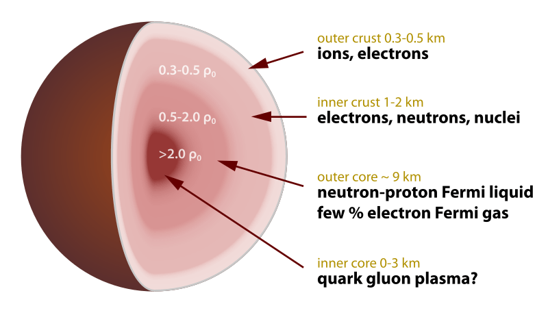 There are likely structured layers in a neutron star, due to the extreme gravity. Those layers probably have different compositions and densities. Scientists think that the strongest material in the Universe, what they call " nuclear pasta," is deep inside the crust of neutron stars. But for now, anyway, there's really no way of knowing. All scientists can do is chip away at neutron stars and see where the evidence takes them.